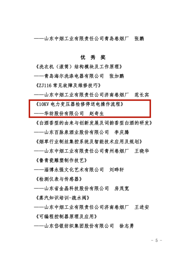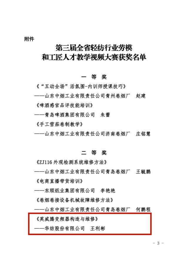 近日,由山東省輕工紡織工會組織舉辦的第三屆全省輕紡行業(yè)勞模和工匠人才教學視頻大賽評比結果揭曉,公司電氣自動化車間硬件技術員王利彬的《英威騰變頻器構造與維修》教學視頻榮獲二等獎、公司電氣副總工、電氣自動化車間主任趙奇生的《10KV電力變壓器檢修停送電操作流程》教學視頻喜獲大賽優(yōu)秀獎。