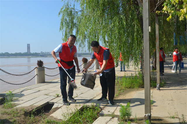 上午8時50分志愿者們準時集合出發(fā),大家身穿紅色馬甲,頭頂烈日、自由組隊,發(fā)揮團隊協(xié)作精神,沿著黃河兩岸徒步行走撿拾垃圾,有的手持鉗夾,有的拿著垃圾袋,認真清理收拾垃圾,將廢棄的煙盒、燒烤殘余等垃圾清理干凈放入袋中。志愿者們充滿干勁,充分發(fā)揚不怕臟,不怕苦,不怕累的精神,積極投身到環(huán)境清潔行動中,成為黃河邊一道靚麗的風景線。