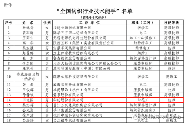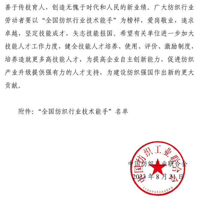 導讀:近日,中國紡織工業(yè)聯(lián)合會發(fā)布了授予在2023年全國紡織行業(yè)勞動技能競賽中取得前18名的紡織企業(yè)員工為“全國紡織行業(yè)技術能手”榮譽稱號的決定,