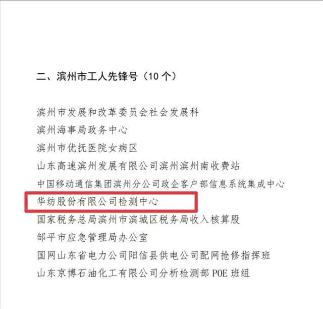 近日,濱州市總工會印發(fā)“關(guān)于濱州市五一勞動獎?wù)潞蜑I州市工人先鋒號的通報”,對華紡股份有限公司檢測中心等“濱州市十佳建功立業(yè)標兵崗”的集體,授予“濱州市工人先鋒號”榮譽稱號。
