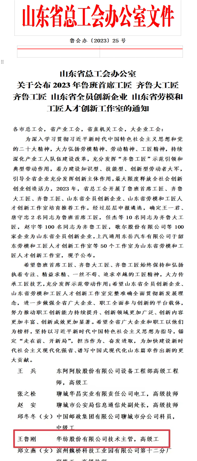 導(dǎo)讀:近日,省總工會(huì)下發(fā)通知,公布了多項(xiàng)獲獎(jiǎng)名單,其中,公司面料車間技術(shù)主管、高級(jí)工王魯剛榮獲第六屆“齊魯工匠”稱號(hào)。