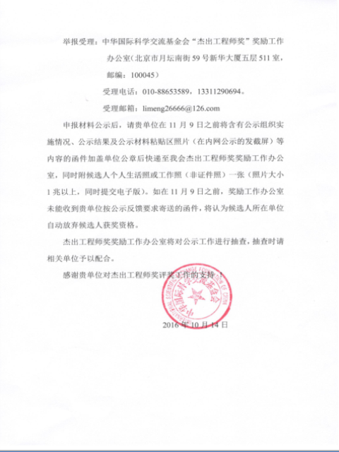 2、關(guān)于做好中華國際科學(xué)交流基金會“杰出工程師獎”獲獎候選人公示工作的通知
